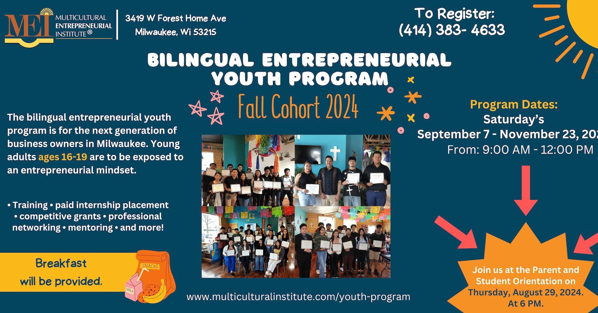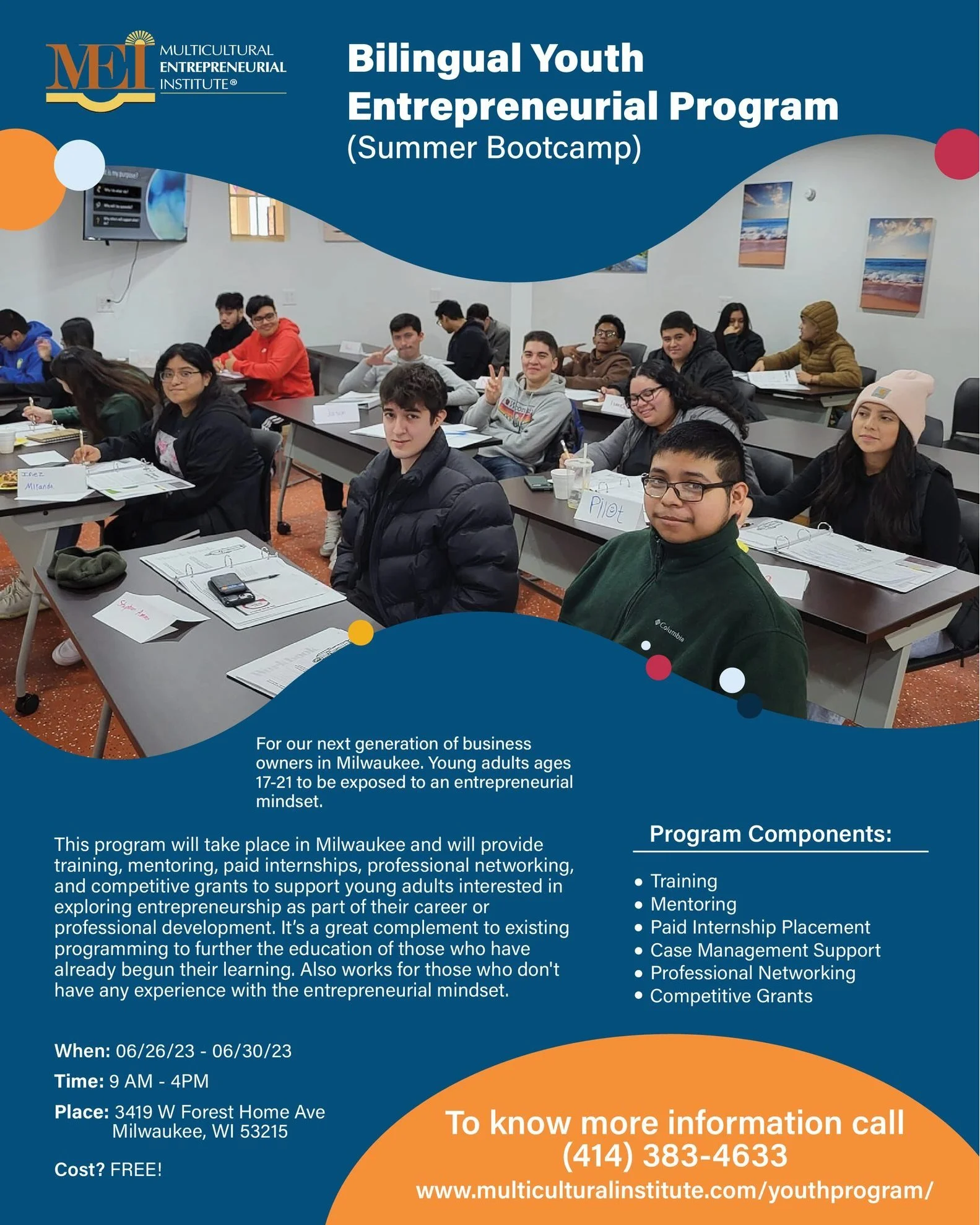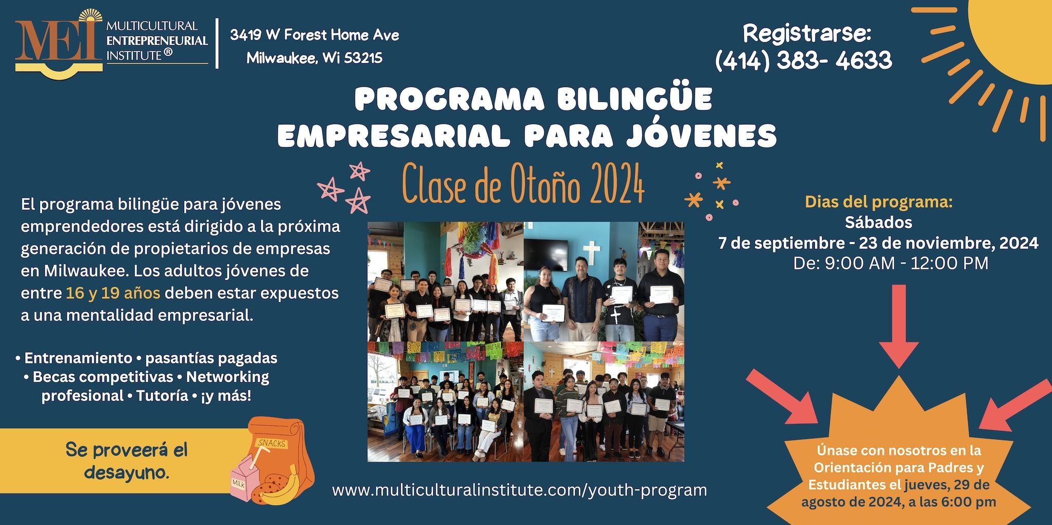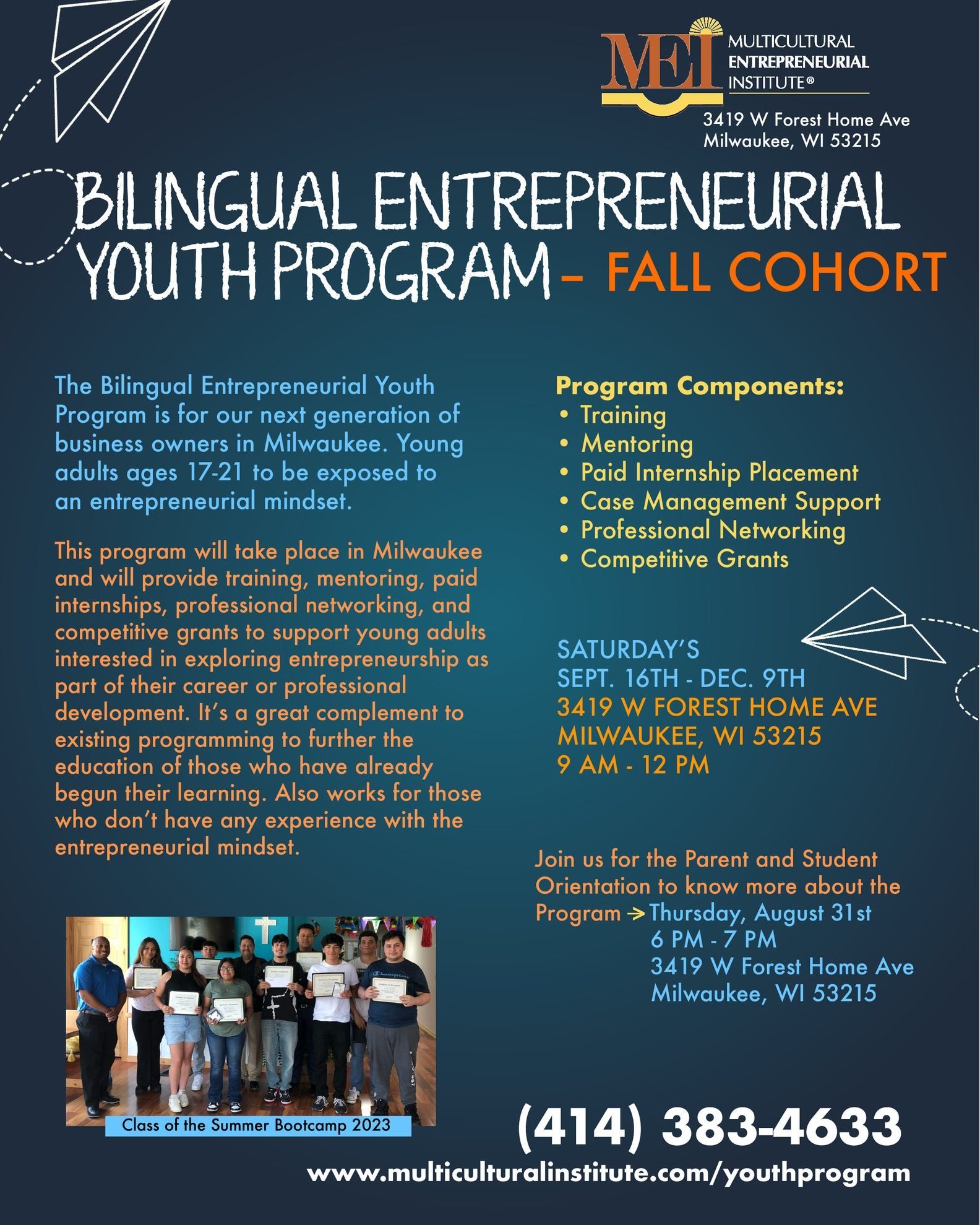 The Multicultural Entrepreneurial Institute hosts a bilingual youth program every spring and fall season of the year. Young adults ages 16-18 are to be exposed to an entrepreneurial mindset. This program provides training, mentoring, paid internships, professional networking, and competitive grants to support young adults interested in exploring entrepreneurship as part of their career or professional development.
