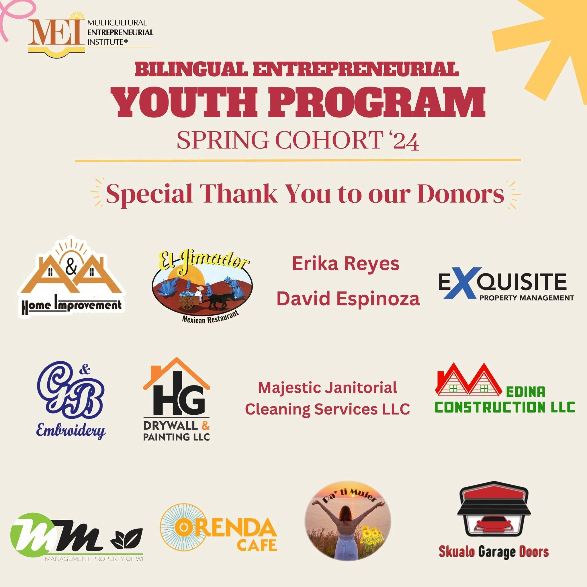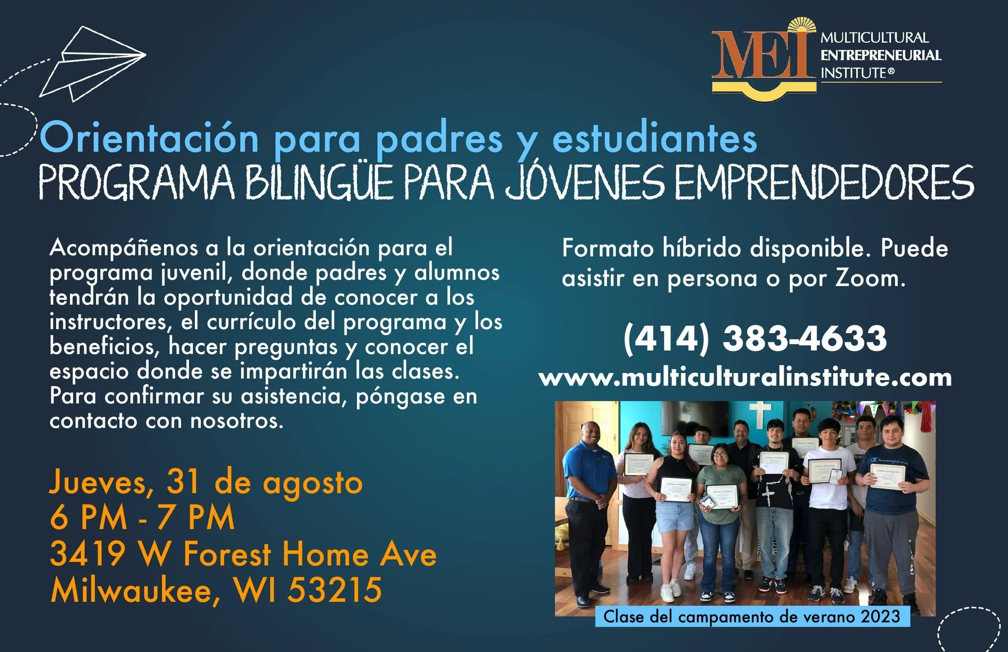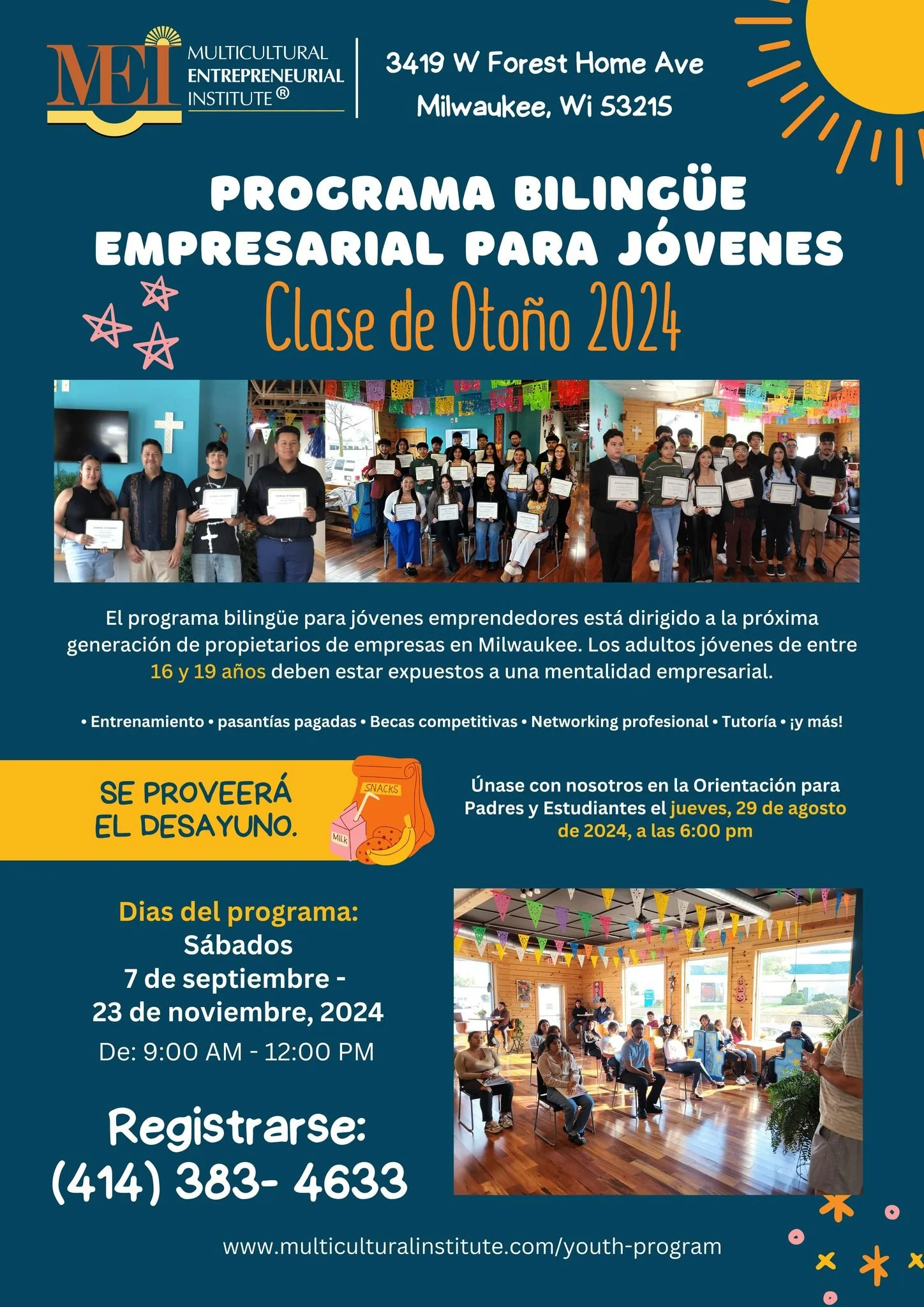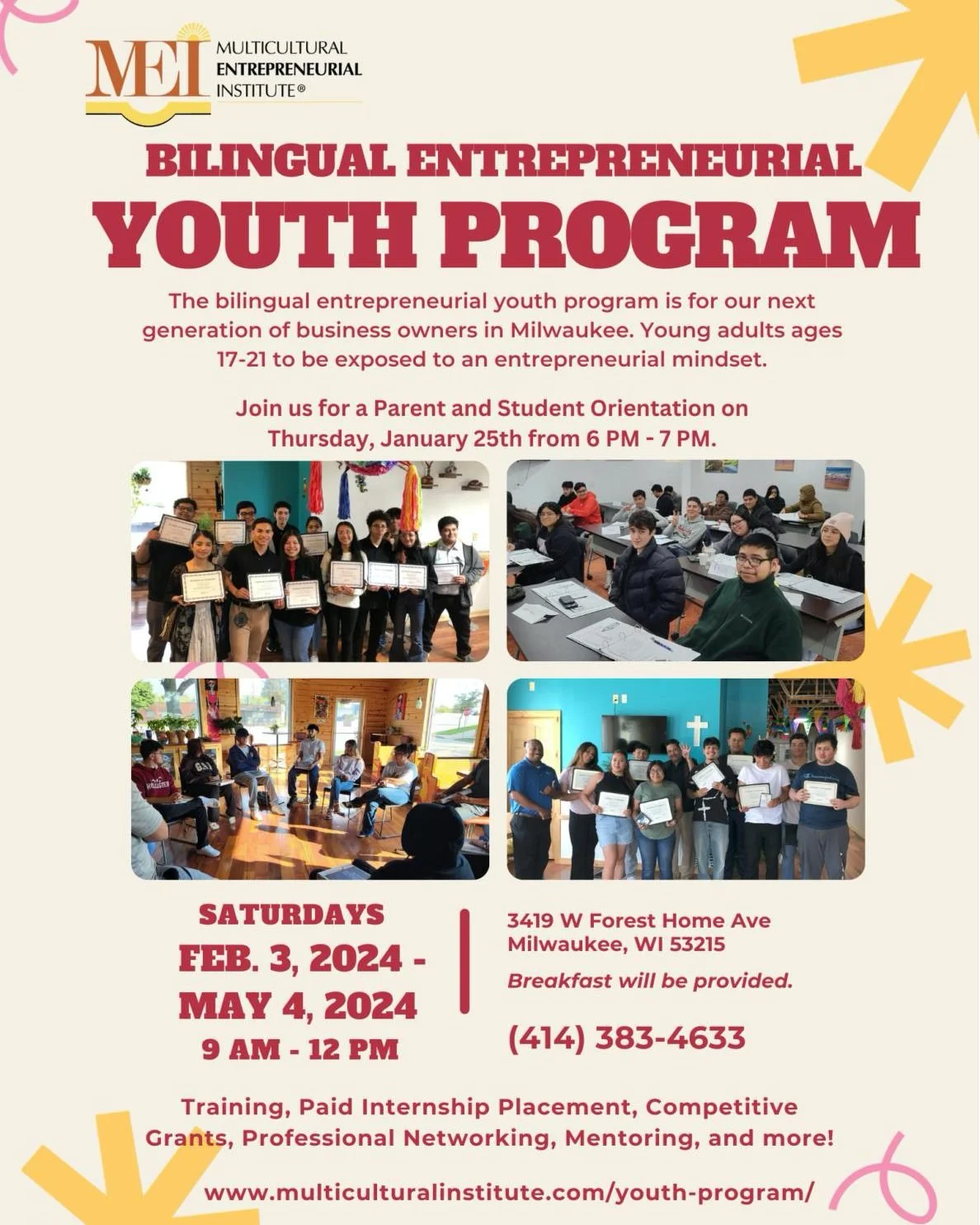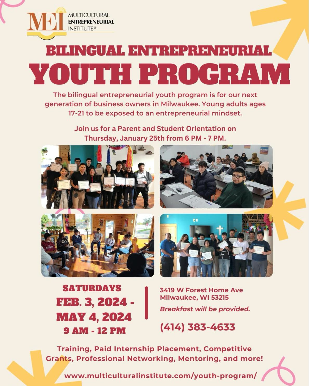 The Multicultural Entrepreneurial Institute hosts a bilingual youth program every spring and fall season of the year. Young adults ages 16-18 are to be exposed to an entrepreneurial mindset. This program provides training, mentoring, paid internships, professional networking, and competitive grants to support young adults interested in exploring entrepreneurship as part of their career or professional development.