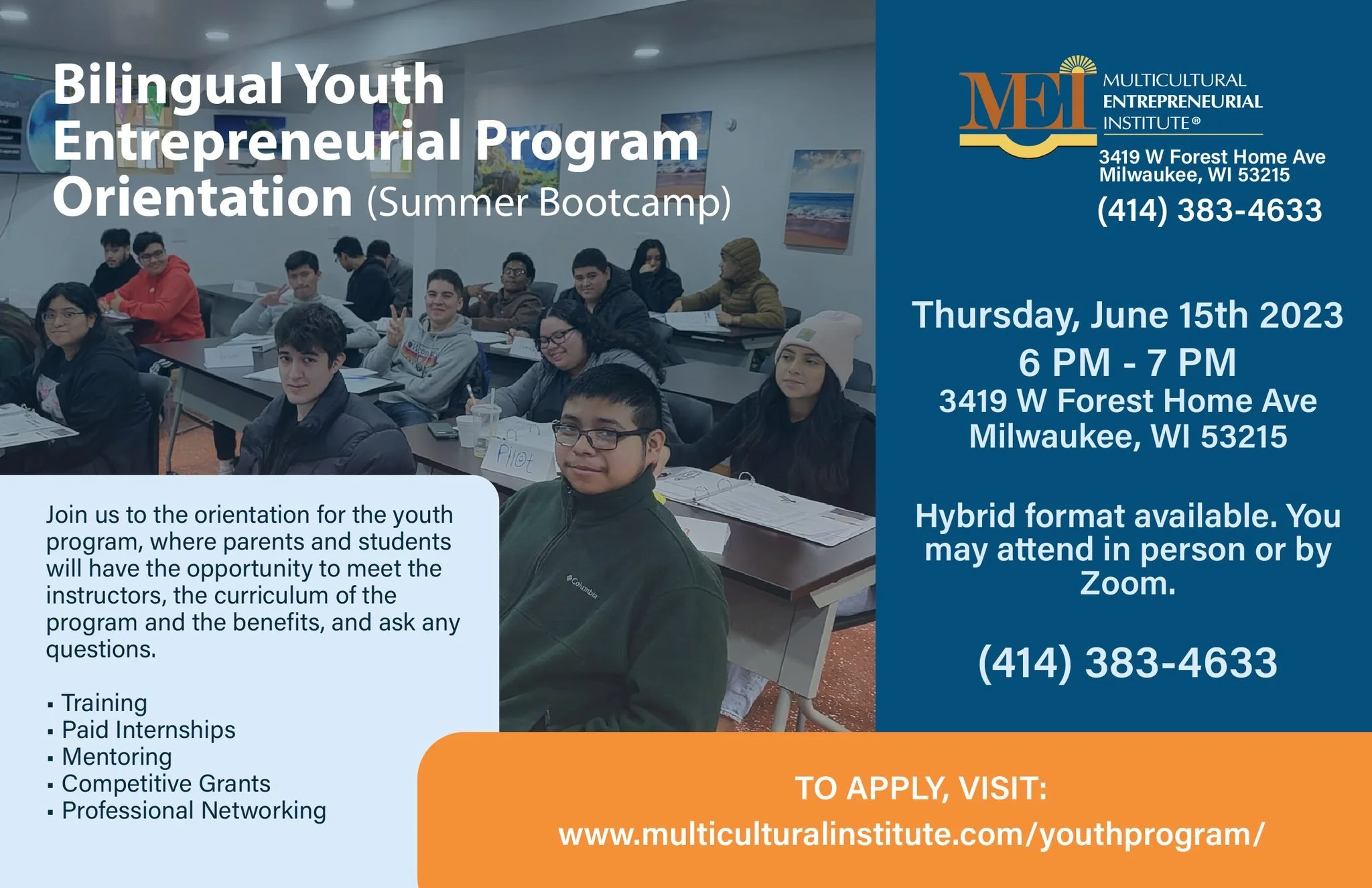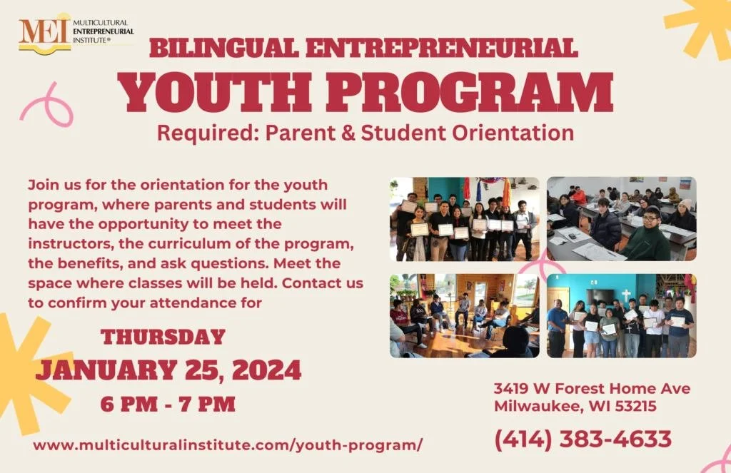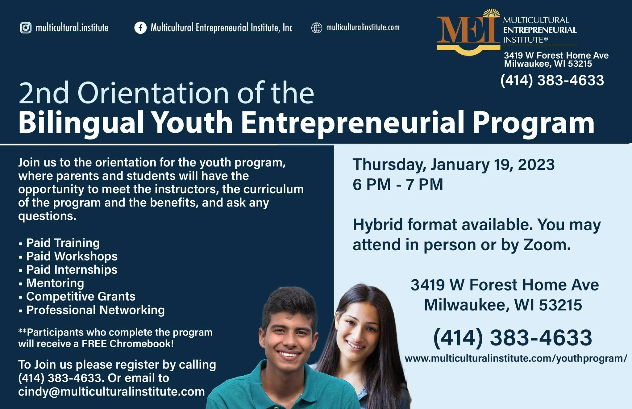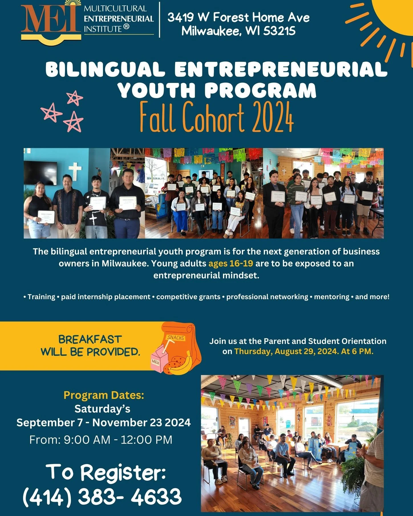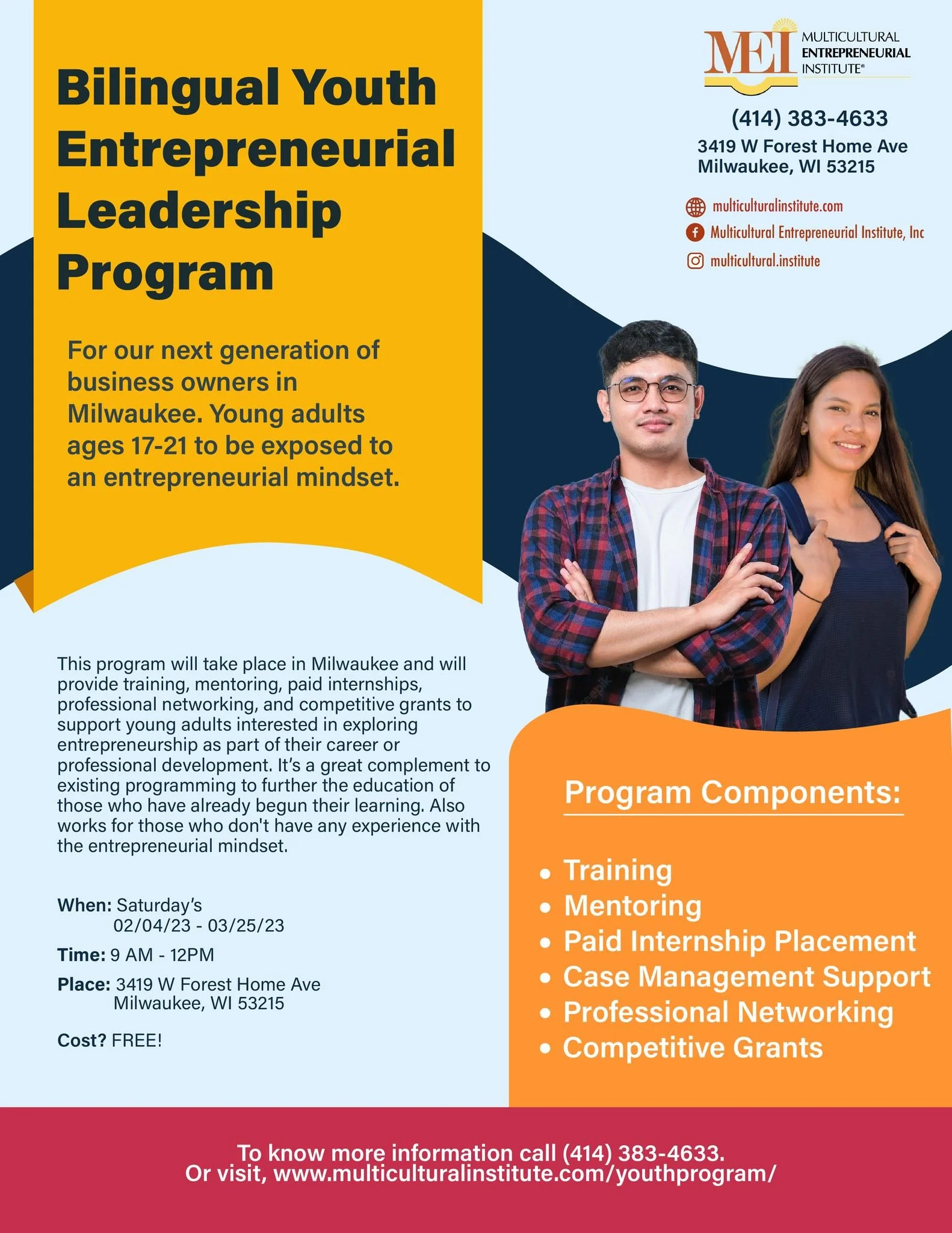 The Multicultural Entrepreneurial Institute hosts a bilingual youth program every spring and fall season of the year. Young adults ages 16-18 are to be exposed to an entrepreneurial mindset. This program provides training, mentoring, paid internships, professional networking, and competitive grants to support young adults interested in exploring entrepreneurship as part of their career or professional development.