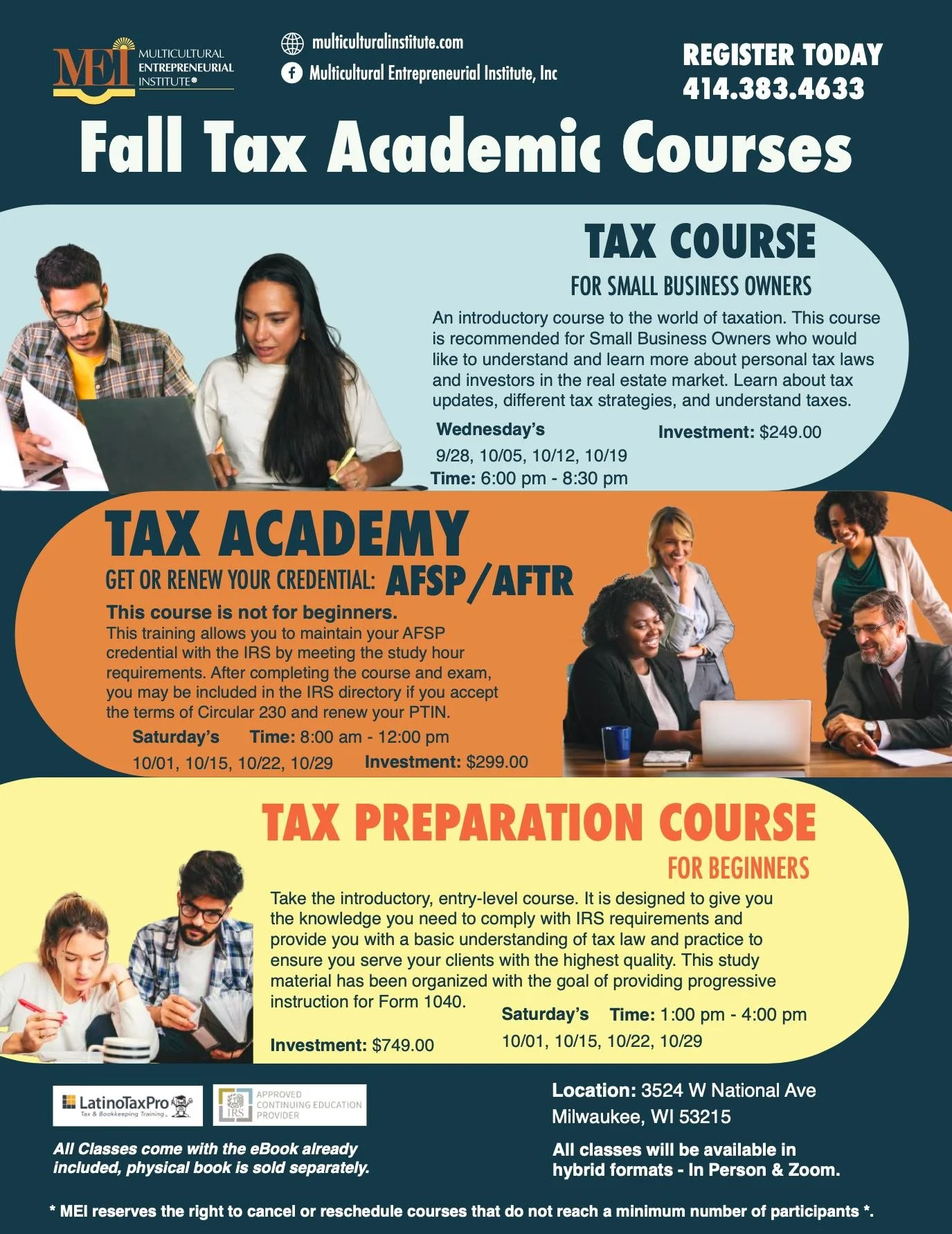 The Multicultural Entrepreneurial hosts their Annual Tax Academy classes in the fall to help prepare entrepreneurs and individuals for the tax season in the coming year.