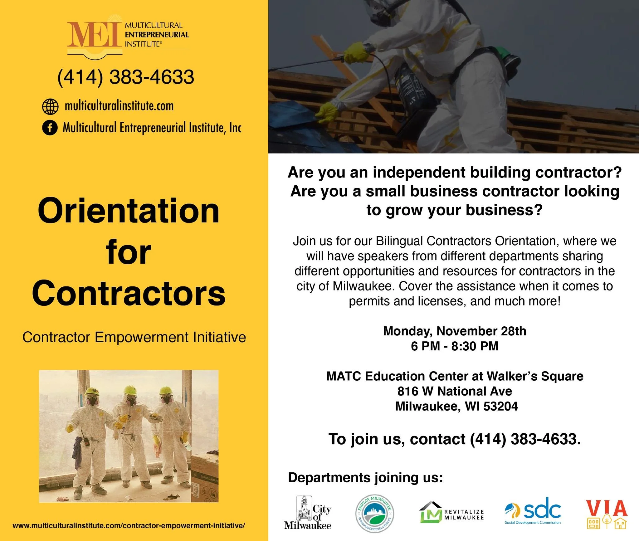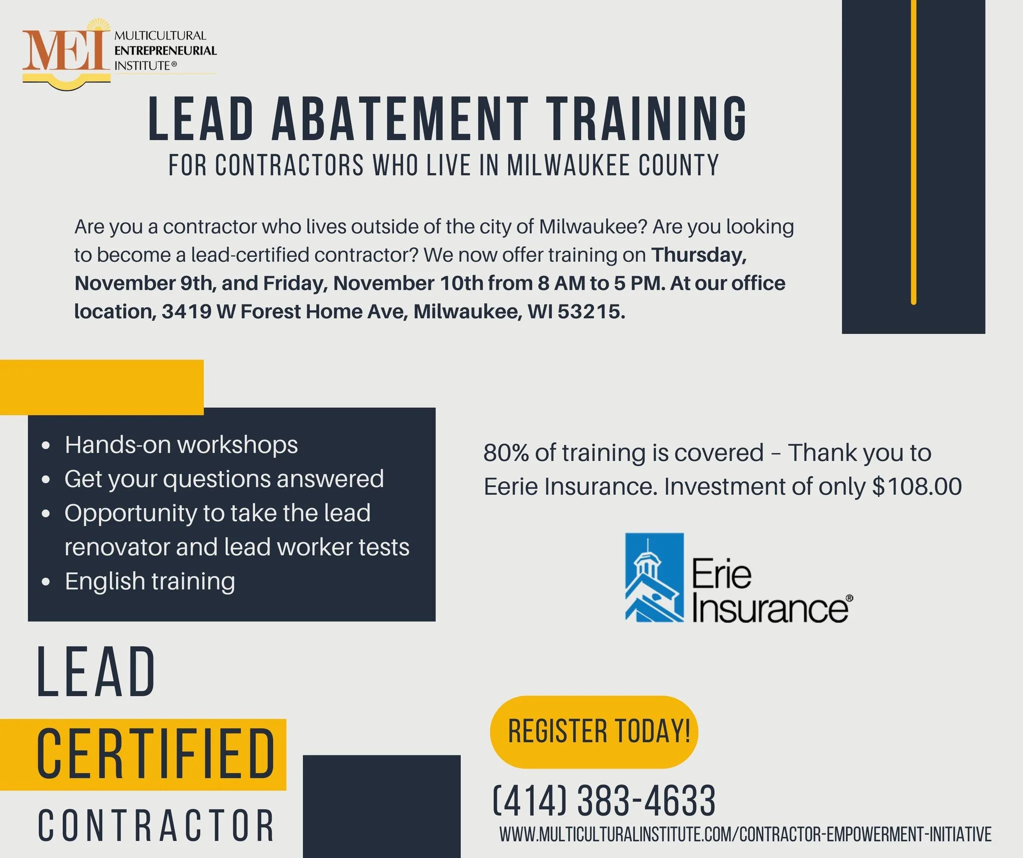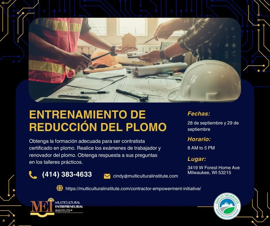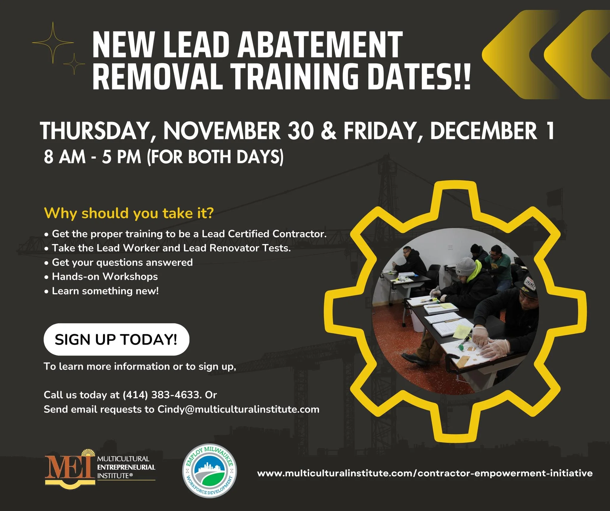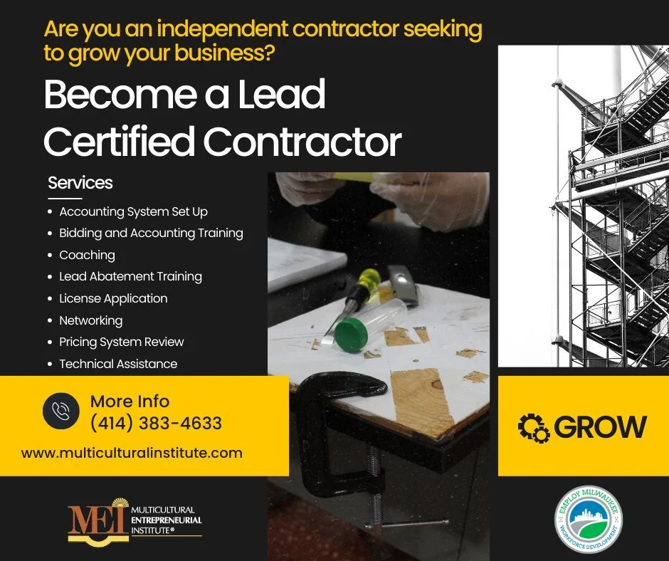 The Multicultural Entrepreneurial Institute provided managerial and strategic planning services for contractors to develop the capacity to perform lead abatement work in the City of Milwaukee. During this program, contractors received assistance with marketing, technical assistance with formalizing their business, and securing licenses or SBE/DBE/MBE certifications. Lead abatement training and informational seminars at no cost to them. Connecting with labor and hiring opportunities, and networking activities for business opportunities.