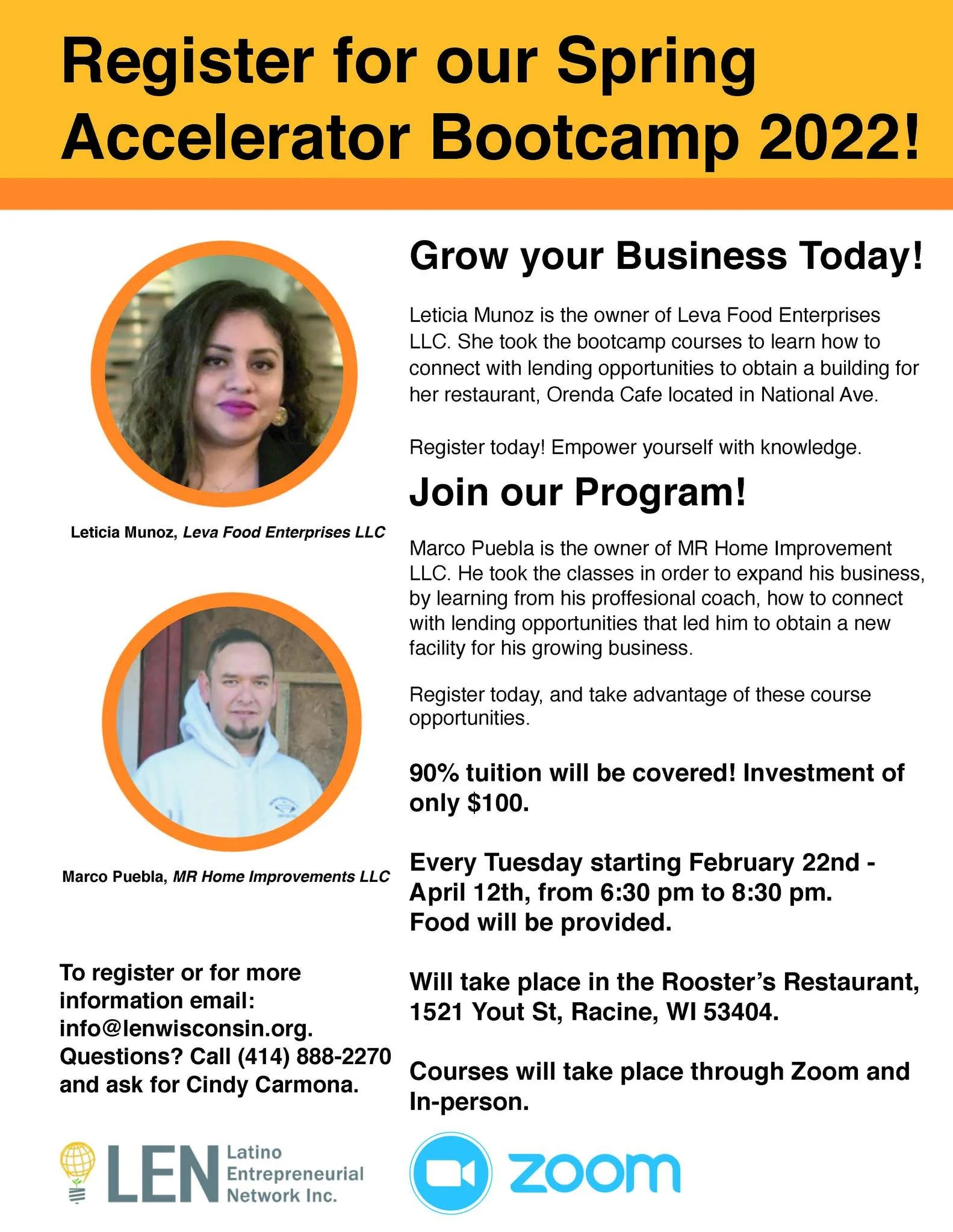 The Latino Entrepreneurial Network hosts a Spring and Fall cohort of the Accelerator Bootcamp, aimed at existing entrepreneurs who have been in business for at least two years and are looking to grow and learn more about the industry. It’s a great program for them to receive coaching and guidance from a professional business coach throughout the program.